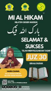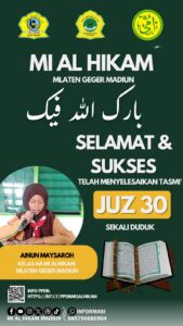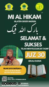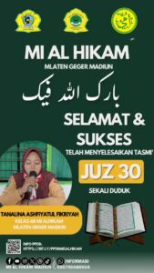 Pada tanggal 10 dan 11 April 2026 beberapa siswa MI Al Hikam telah mengikuti Tasmi’ Al-Qur’an Juz 30 bil-Ghaib. Selain hafal, mereka juga dilatih untuk fasih dalam melafalkan Al-Qur’an. Beberapa anak juga telah menyelesaikan tasmi’ bil-Ghaib juz 29. Dengan metode ummi yang digunakan di MI Al Hikam, serta guru-guru yang berkomptensi, diharapkan dapat membimbing para siswa dalam tadarus Al-Qur’an dengan baik.